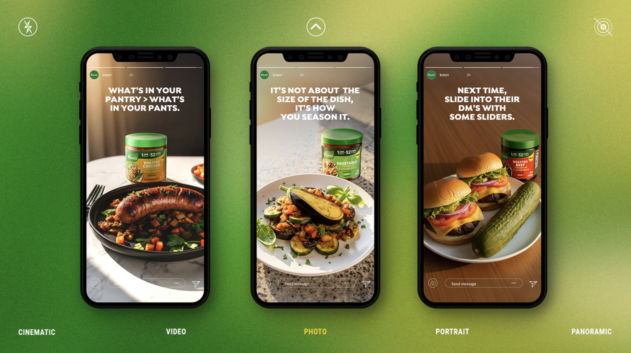 Knorr is a brand synonymous with flavor, targeting Millennials and Gen Z βFlavormakersββhome cooks who love to impress. For the launch of a new bouillon product, we tapped into two cultural truths: more than 50% of women have received an unsolicited explicit photo, and three out of four Americans find a partner who can cook to be attractive.